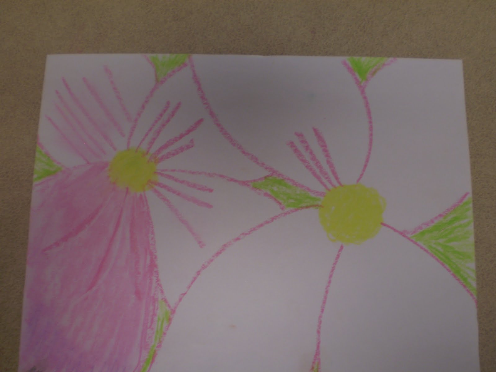 -Students are given a white piece of paper and oil pastels with which to create their flower. Be sure to model how to use oil pastels. For some students it is hard create a 'blown up' version of the flower, but with a teacher model, they can do it.